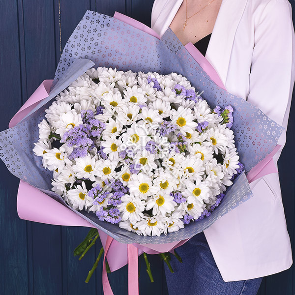 Белые цветы ромашковидной кустовой хризантемы  в сочетании с невероятно нежной фиолетовой статицей создают волшебную и свежую цветочную композицию, которой хочется любоваться!